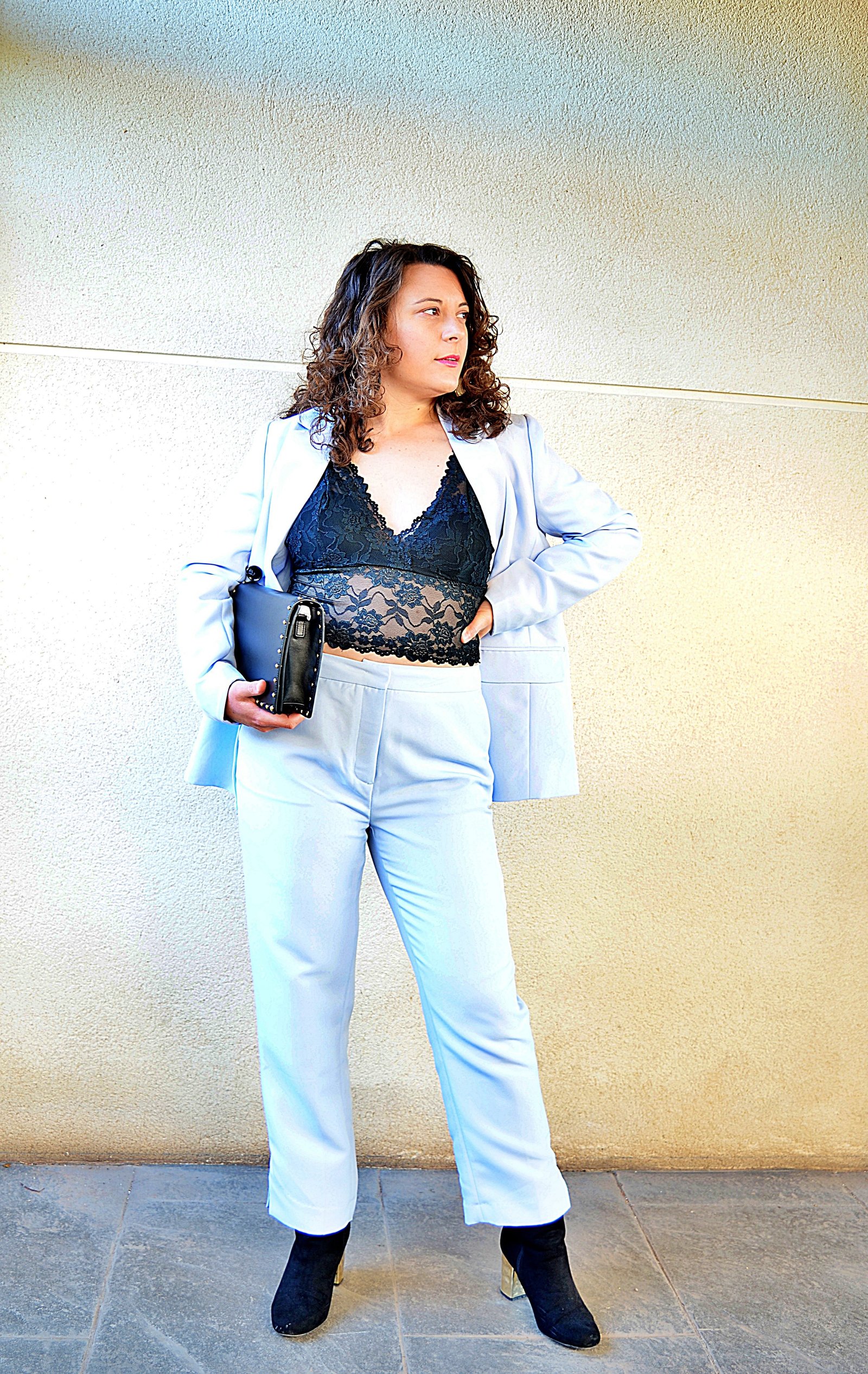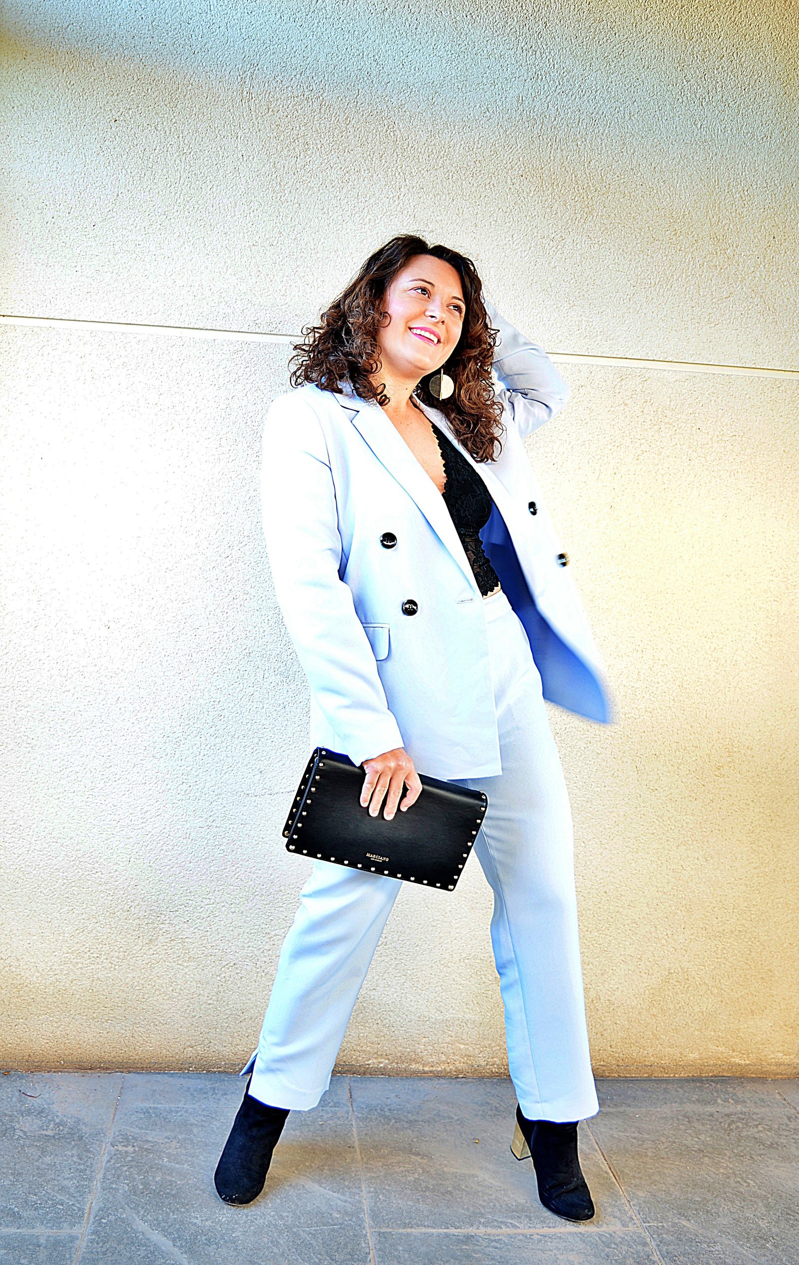 La combinación fue sencilla. El traje azul celeste con los botones en negro, así pues el resto de los complementos como los botines negros con tacón metalizado y el bolso de mano negro de Marciano by Guess.